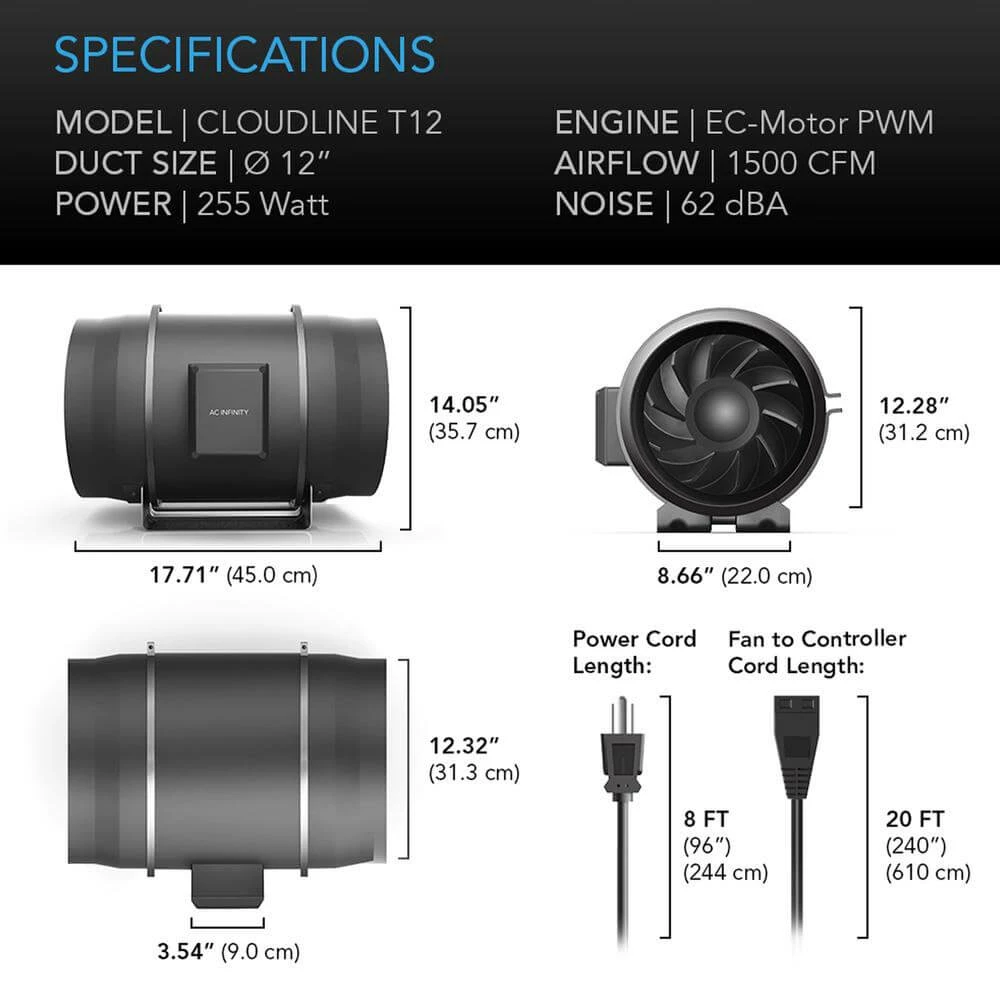 The AC Infinityย Cloudline T12, Quiet Inline Duct Fan System With Temperature & Humidity Controller, 12-inch is a smart inline duct fan designed to quietly ventilate hydroponic grow rooms, boost heating/cooling to rooms, circulate fresh air, exhaust projects, and cool AV closets. Featuring an inline mixed-flow design, the duct fan can maintain airflow even in high static pressure applications. Contains an EC-motor with PWM-control for a quiet and energy efficient performance. The motor box containing the fanโs impeller and blades can be detached from the mounted frame for easy cleaning and maintenance. Includes an intelligent controller that features advanced programming and functions. Complete kit includes one duct fan unit, one thermal controller, one corded thermal probe, two duct clamps, installation manual, all necessary mounting hardware, and a corded AC plug adapter to power the unit through a standard outlet.
