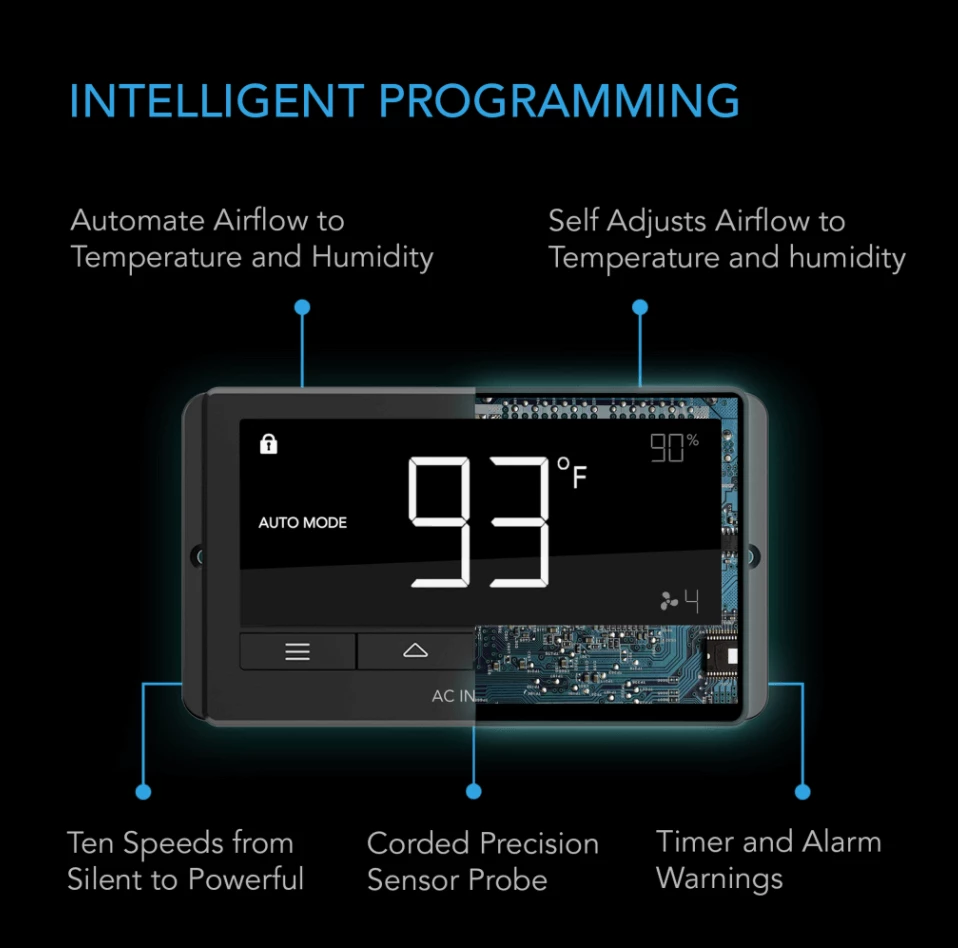 - Dynamic temperature and humidity programming, with timers, grow cycles, scheduling, minimum speed.