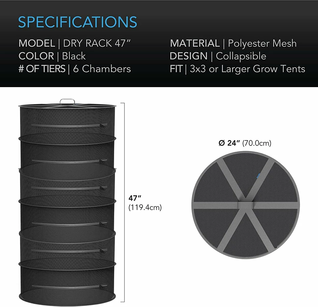 This netted mesh drying rack is designed to dry and cure plants, such as flowers, buds, and seeds. Each multipurpose plant hanger has a flexible steel wire frame covered by a non-toxic polyester mesh that is wrapped in multiple tiers. This frame can support larger and heavier loads, while its flexibility enables collapsing to store and move the drying rack as needed.