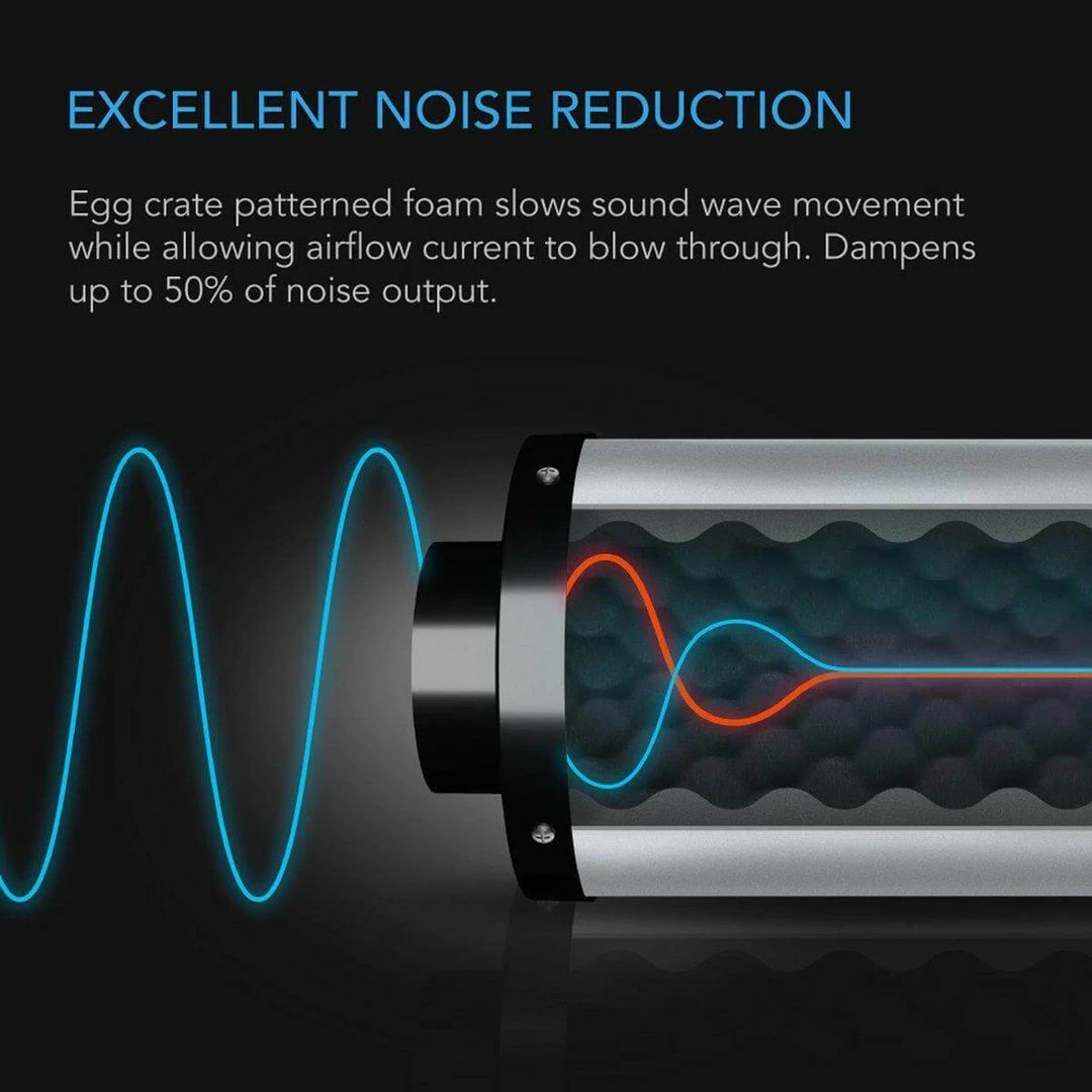 The AC Infinity, Inline Duct Fan Silencer, 6-Inch ventilation ducting tool is designed to dampen or reduce noise coming from airflow in grow tent or server closet ventilation systems. It utilizes high-grade neoprene foam crafted in a wave crest pattern that diminishes sound wave movement, reducing noise pollution by up to 50%. The egg crate foam muffles sound vibration while allowing maximum airflow passthrough for both intake and exhaust configurations. Both aluminum flange openings also assist in absorbing sound waves from vibrations, seamlessly fitting over your inline duct fanโs flange. Each silencer is built with a solid galvanized steel body that is corrosion-resistant and can withstand extreme temperature changes.