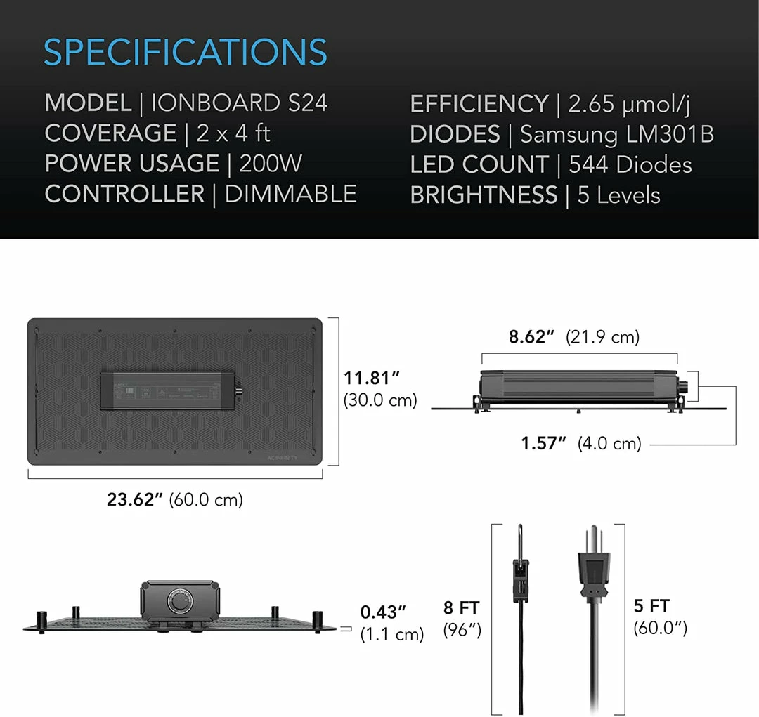 - Specially formulated full-spectrum Samsung LM301B LEDs to achieve the highest growth rates in all plant stages.