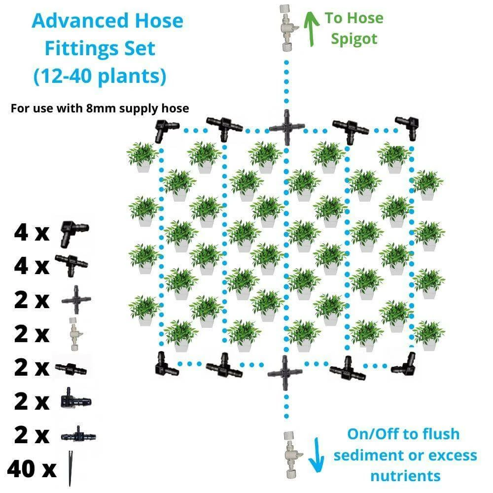 This set contains the fittings for an advanced hose/spigot fed blumat system.