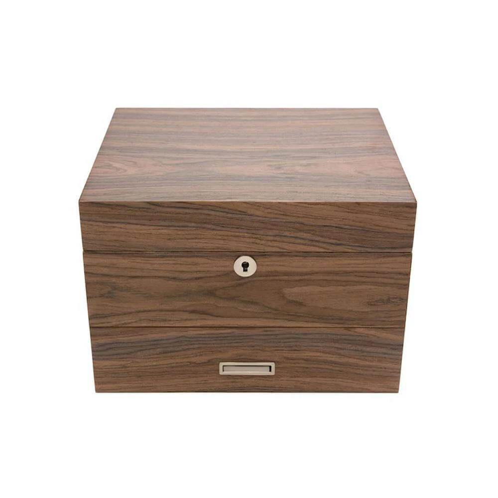 The 8-Strain (with drawer) Cannador® can hold a larger quantity of eight of your favorite strains (six smaller sized glass cups and two larger glass cups). The larger glass cups can each hold 1/2 oz and the smaller glass cups can each hold 1/4 oz for a total of two and a half to three ounces. This is an excellent option for someone who enjoys large quantities or a large variety. Top portion of the Cannador® can lock to ensure your contents are safe and secure. It is lined with mahogany on the interior and walnut veneer on the exterior.