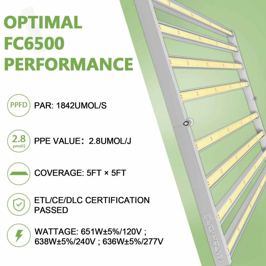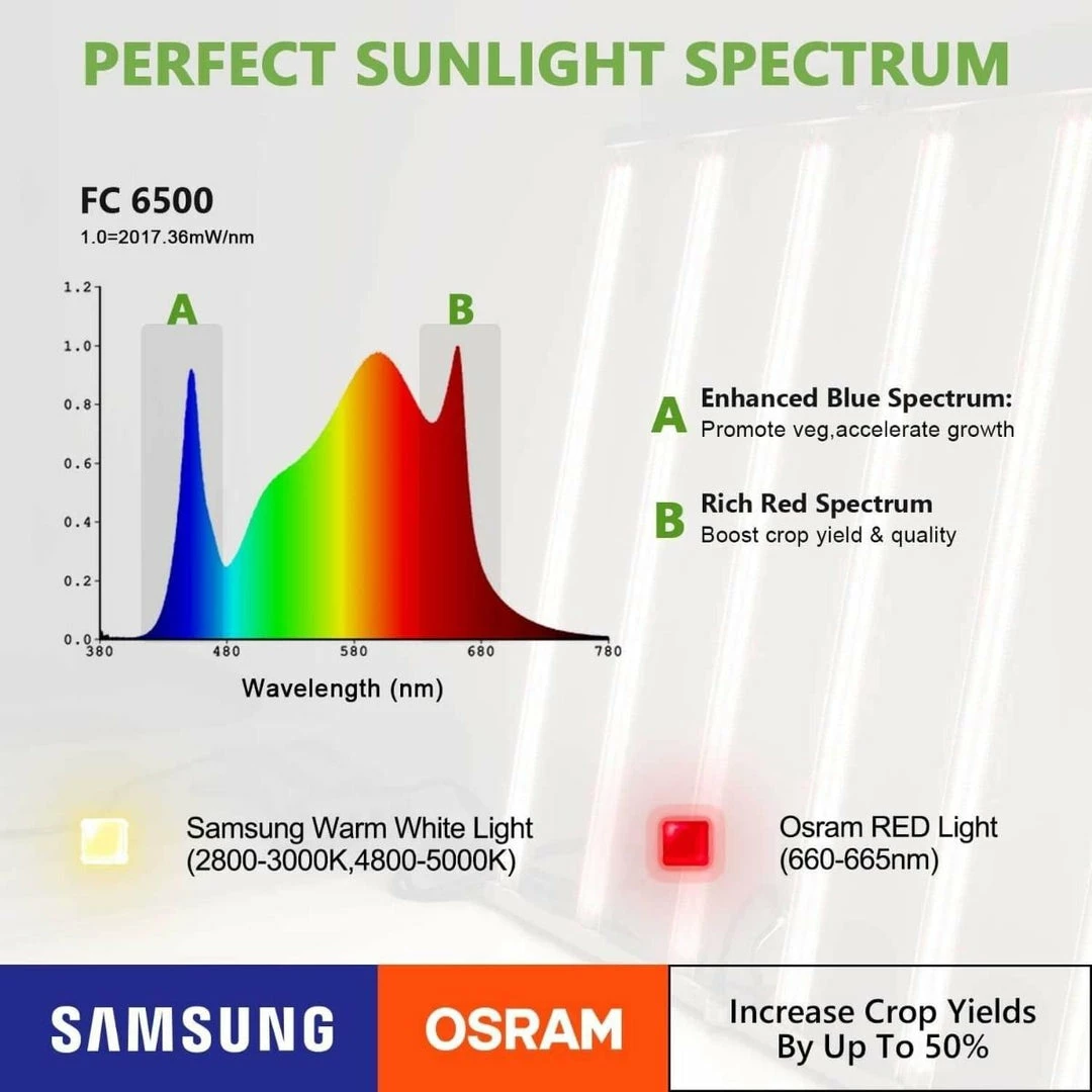 - Maximize Yield and Quality: The MarsHydro FC6500 LED grow light with 2688pcs Samsung LM301B & Osram 660nm Diodes has the highest efficiency 2.85 µmol/J, Max 2.5g yield per wattage with 30% greater Average PPFD, and only uses 680w of perfect light for 4’x4′ full cycle growth.