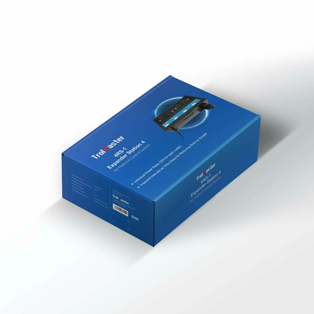 The 4RS-1 is a universal 4-outlet power expansion module. It can be used with any of TrolMasterโs โplug-inโ style device modules to expand the number of devices that can be controlled by the Hydro-x. A single 120-240 volt โtriggerโ cable on the 4RS-1 connects to your device / control module. When the device module is activated by the Hydro-x, the 4RS-1 trigger cable will turn on each of the 4 receptacles on the 4RS-1 with a 3 second time delay between each outlet being activated. That minimizes high start-up (inrush current) and allows up to 4 devices to be safely controlled. The 4RS-1 must be installed with a 120/240 volt power circuit (up to 50-amps @ 240vac). Three wire terminals inside the unit accept up to #6 AWG wire making connections to the power source easy.ย